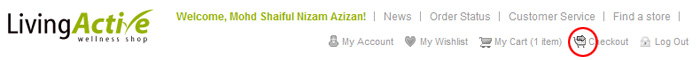 - Apabila anda telah selesai membuat pilihan barang tekan 'checkout' (terdapat di bahagian atas laman web Living Active Store)