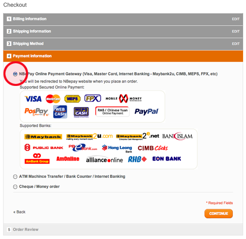 - Masukkan semua maklumat yang diperlukan dan aliran proses 'checkout' kami adalah mudah. Pada bahagian 'Payment Information' pilih NBE Pay Online Payment Gateway