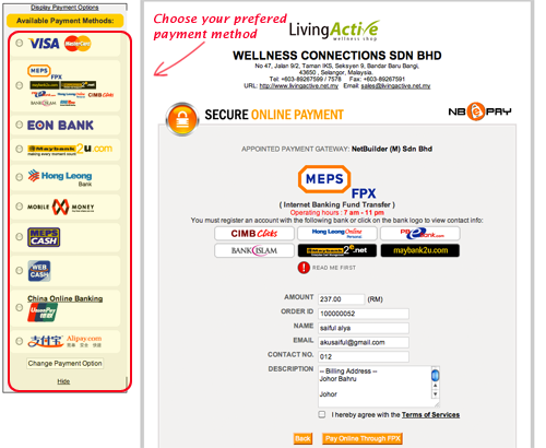 - Pada bahagian sebelah kiri pilih pilihan jenis pembayaran, Sila pilih method pembayaran yang akan dibuat, dalam kes ini pilih MEPS FPX untuk pembayaran melalui CIMB Clicks (Maybank, Public Bank, Hong Leong Bank dan Bank Islam juga boleh dibuat melalui MEPS FPX)