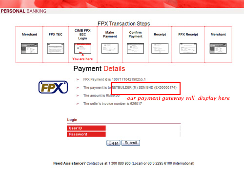 - Login bank akan dipaparkan. Login ke akaun anda dan perhatikan pembayaran akan dibuat ke Netbuilder (Netbuilder telah dilantik oleh Wellness Connections Sdn. Bhd. untuk membuat kutipan pembayaran)