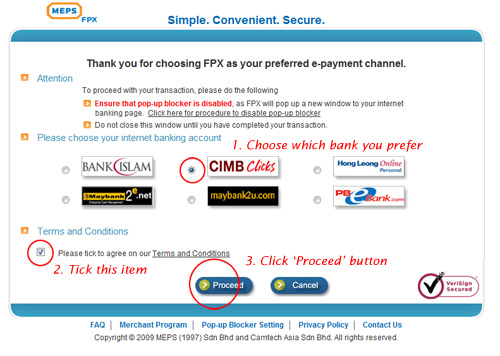 - Pilih jenis bank yang akan digunakan, klik setuju dan tekan button 'Proceed'.